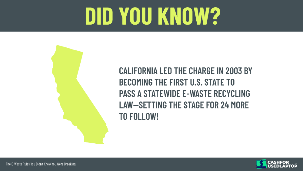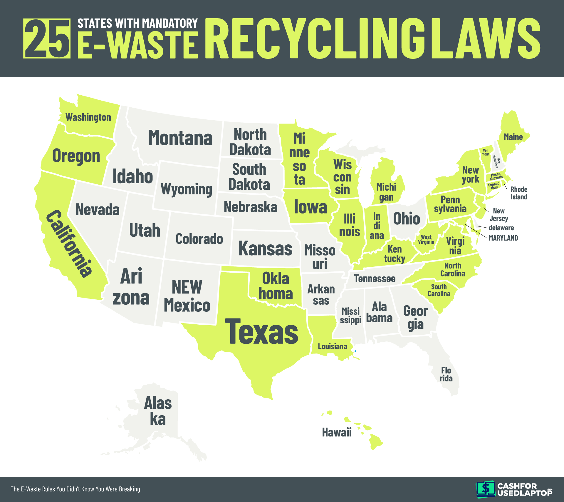 California was the first state to take a stand with its Electronic Waste Recycling Act of 2003, and set the stage for how e-waste is managed. Other states like Minnesota, Connecticut, and Oregon soon followed. As of now, 25 states (plus Washington, D.C.) have their own mandatory laws for e-waste recycling. These rules vary, but they’re all aimed at solving one key issue: what do we do with all this digital clutter?
