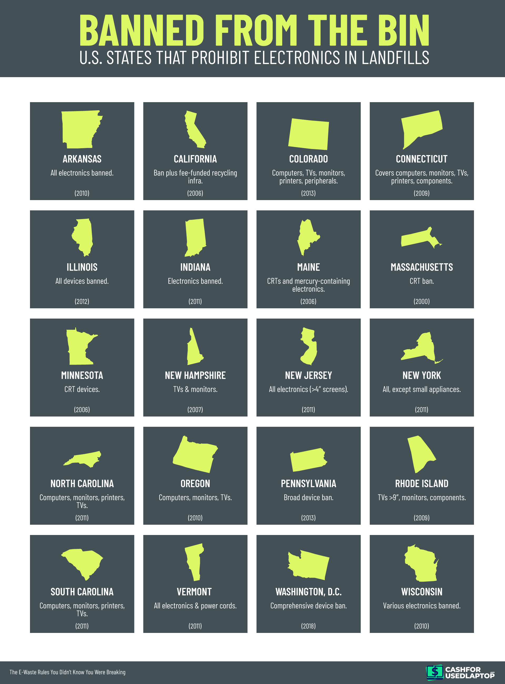 Landfill bans are real and widespread. Many states have strict bans on dumping certain types of electronic devices in landfills. That’s because items like phones, laptops, CRT TVs, and batteries can contain harmful substances like lead, mercury, and cadmium, which can seep into the soil and contaminate water sources.